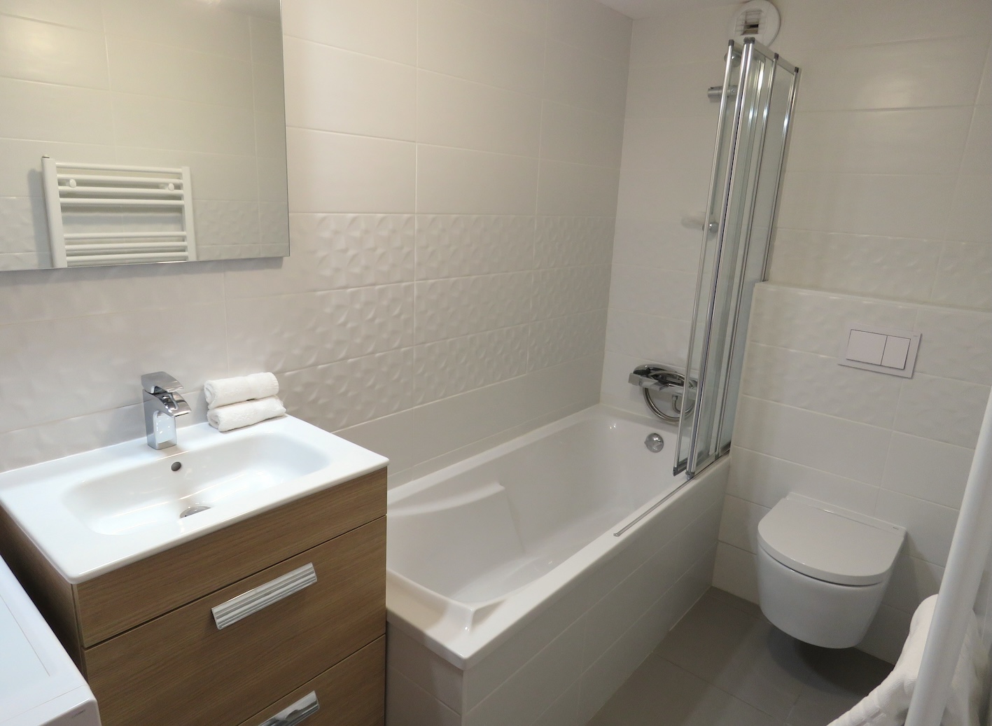 The living area has two comfortable sofas to seat 6-7, a flat screen TV with french TV. There is seating for eight around the dining room table and the modern kitchen has everything you need for a self catering holiday : microwave, cooker, electric hobs, large fridge, dishwasher and washing machine.
