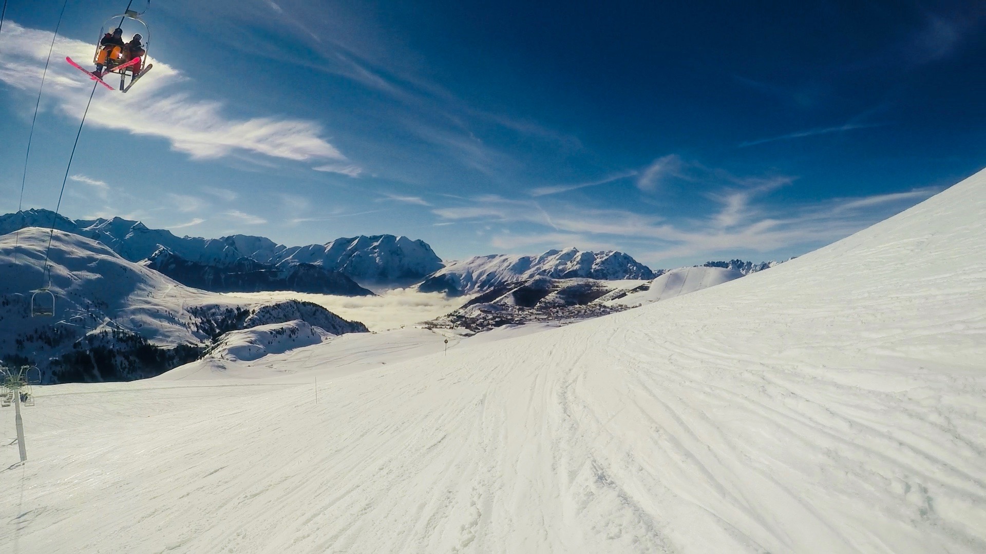 Well its been an epic season, some of the best conditions in Alpe d'Huez certainly in the last 10 years that we have been ski-ing here. It started in early December with some huge snowfalls in the Alps and has continued with regular dumps of snow week after week. What's been different this year is that we've not had the mild spells of recent years and temperatures have been consistently cold meaning that when storms rolled in there were huge dumps of fresh light powder. This was the scene that greeted me when I left the apartment for the first day of the season on 10th December.