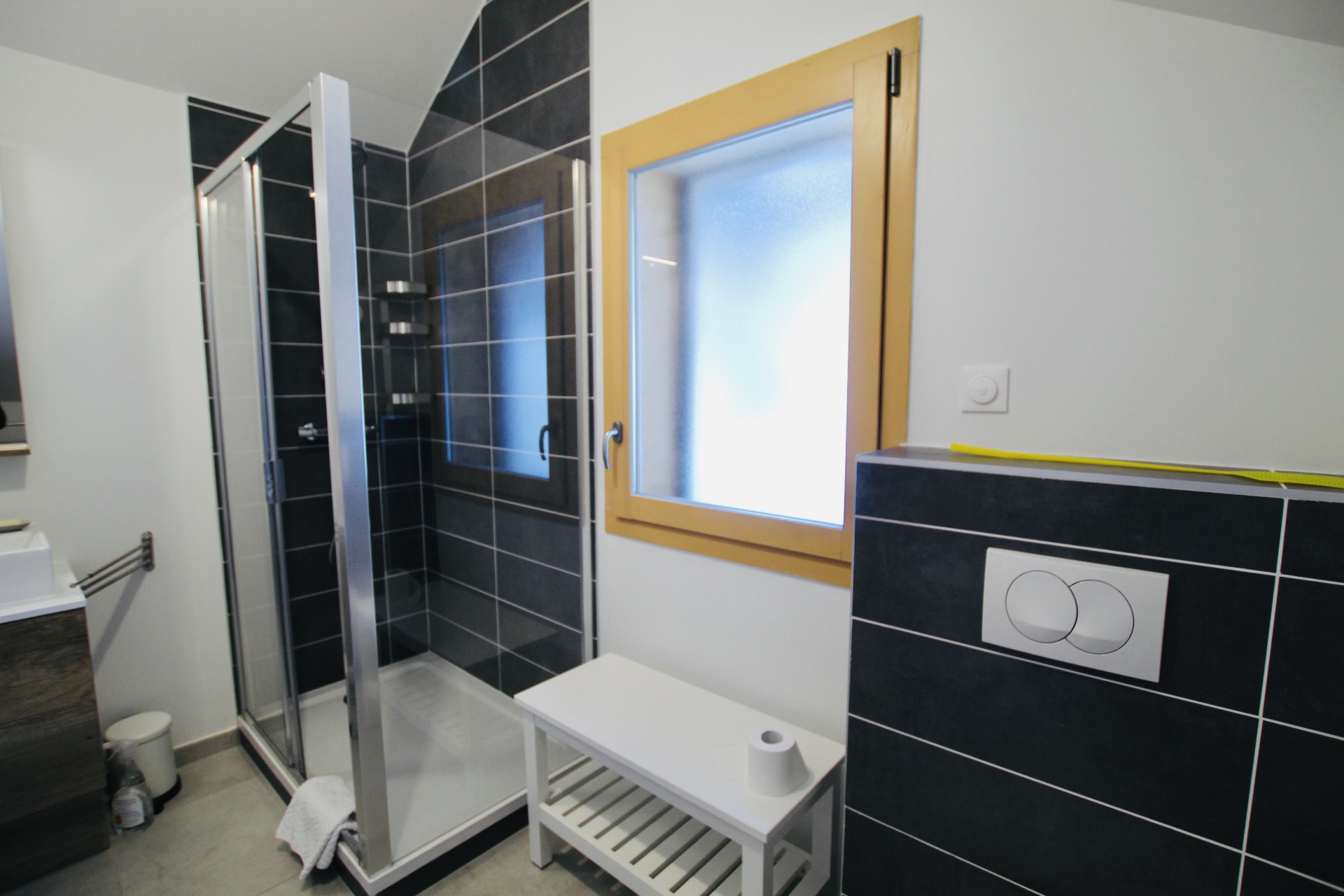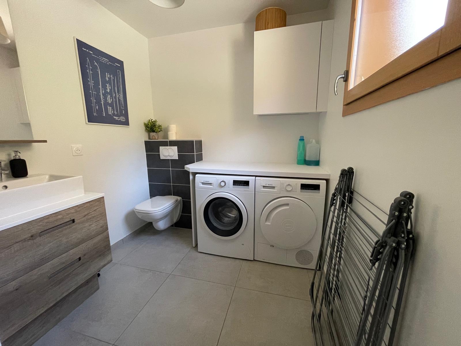 Premier étage Grand espace de vie ouvert avec cuisine et table à manger de 12 places, coin salon confortable, s'ouvrant sur un grand balcon avec une vue imprenable, buanderie avec lave-linge, sèche-linge et toilettes, nombreux placards de rangement, accès au garage et au local à chaussures. Il y a une télévision à écran plat avec accès à la TV Orange (chaînes françaises) dans le salon ainsi qu'une grande télévision avec accès au streaming numérique dans la salle de cinéma au premier étage.